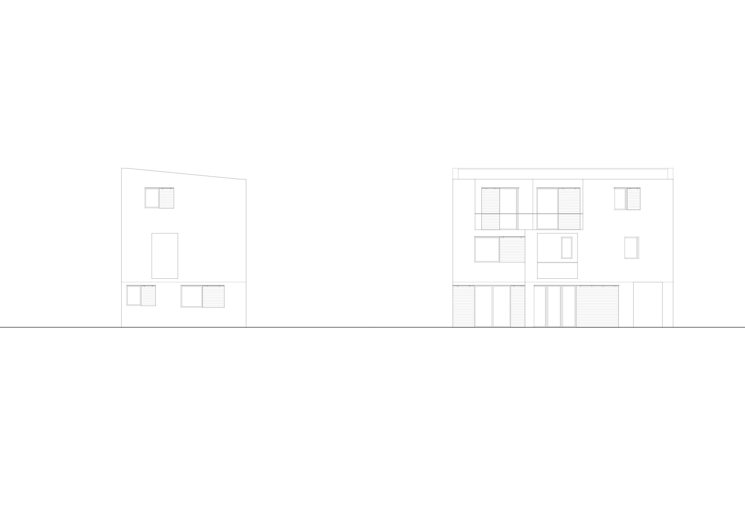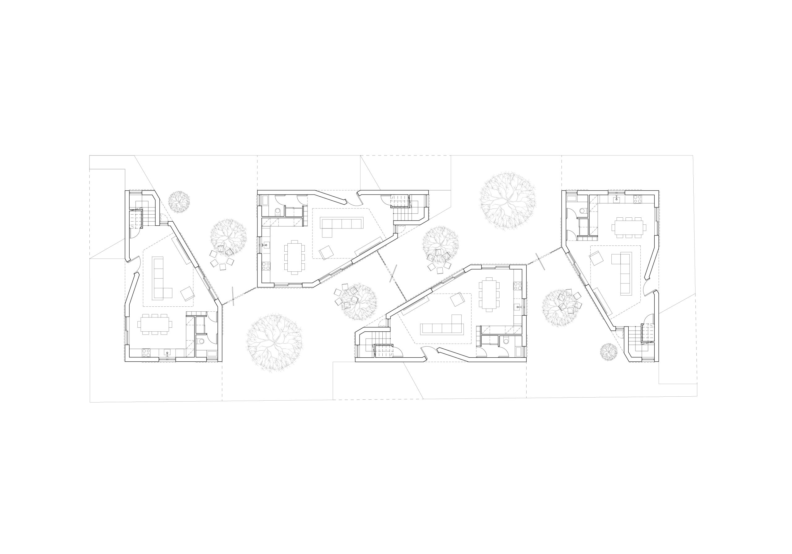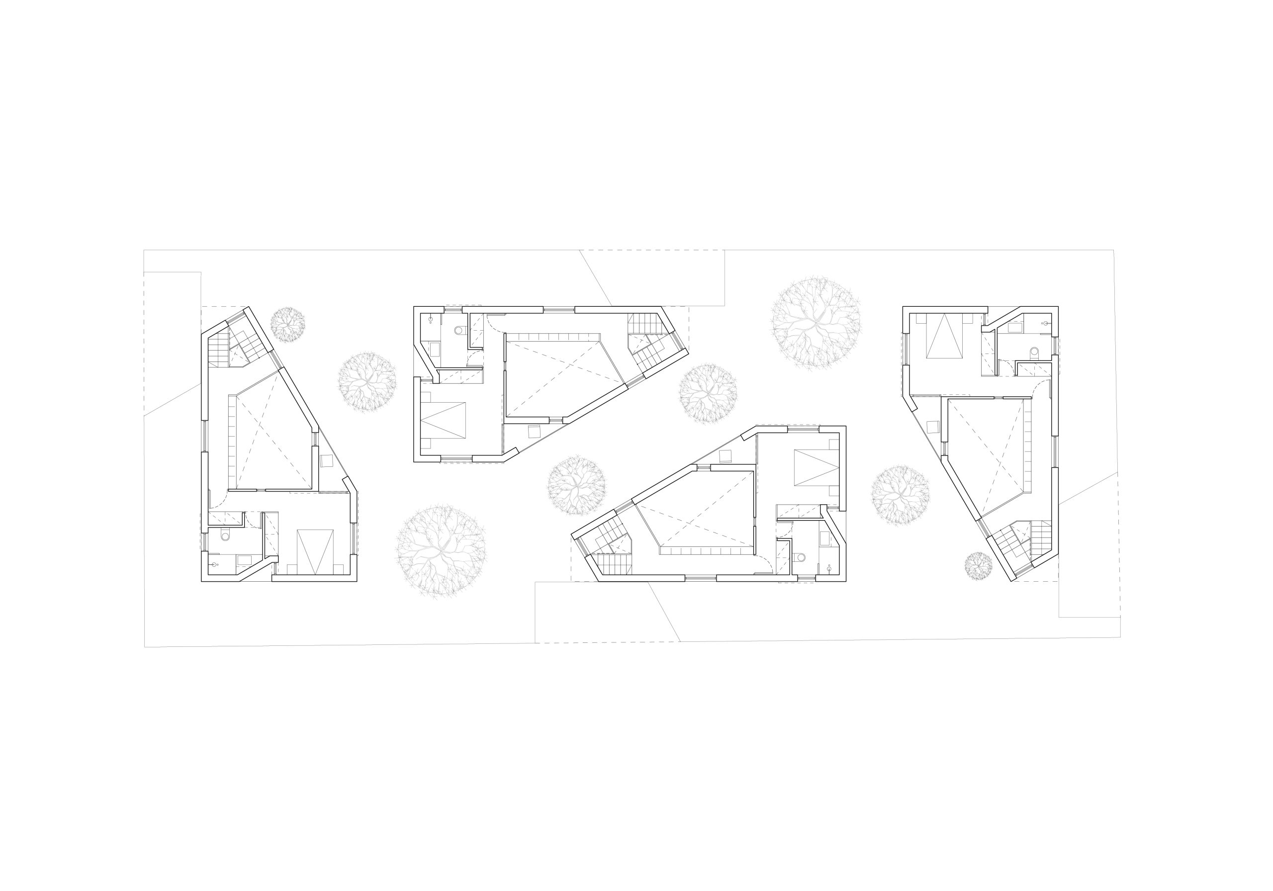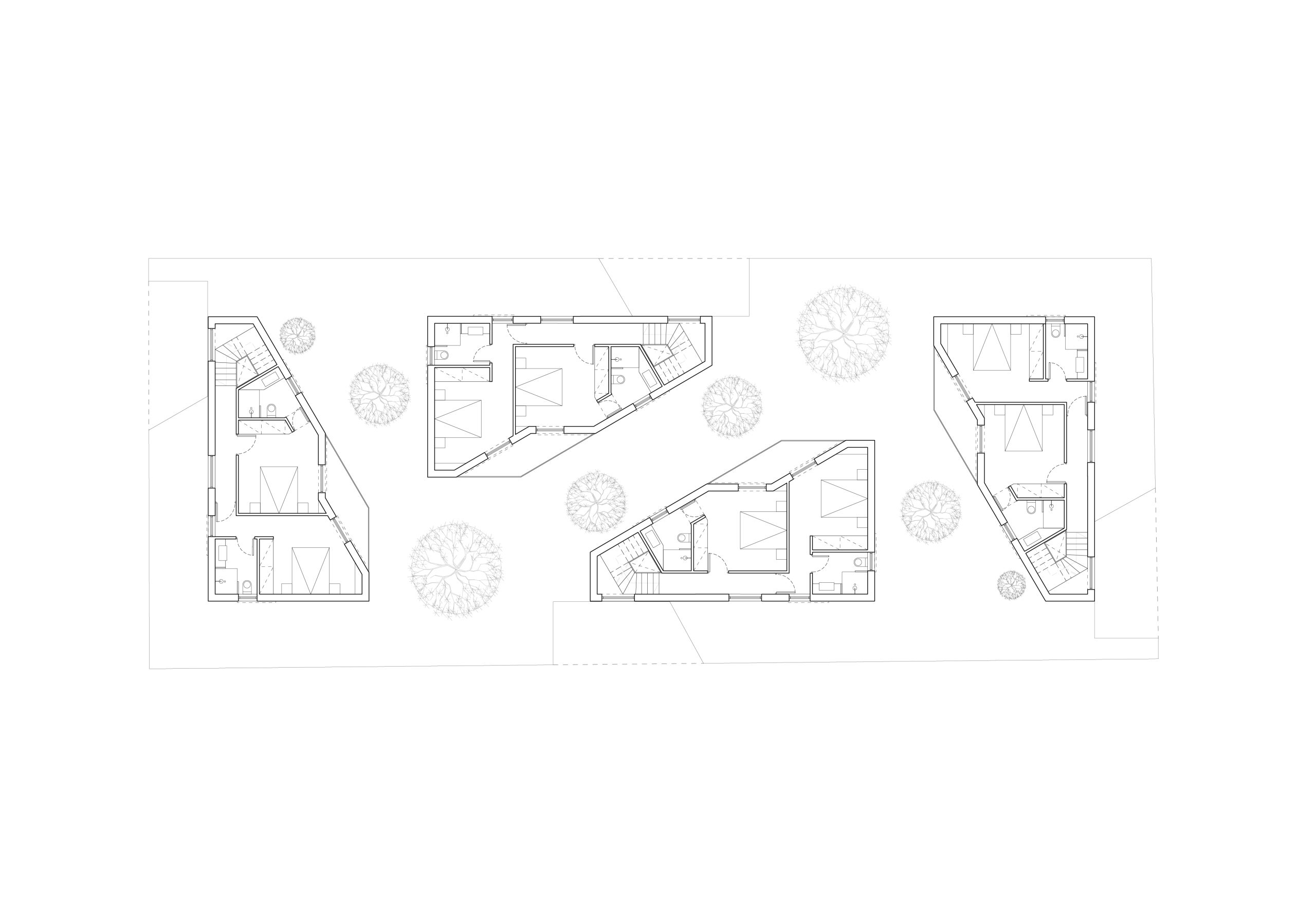 Perched within a compact urban block in Nea Playia, the project organises four compact houses around an enclosed urban garden so that façades and internal courts become the principal view. The scheme withdraws from the street and arranges living spaces around intimate courts, terraces and raised patari mezzanines; double-height voids, upper balconies and aligned openings produce controlled sightlines that balance privacy with measured porosity. A stone plinth anchors light, white-rendered volumes above, while timber shutters, narrow gaps and cypress planting mediate exposure and create a cooler microclimate. The result is a self-contained, inward-facing community in which the architecture — rather than the exterior landscape — defines the prospect.
