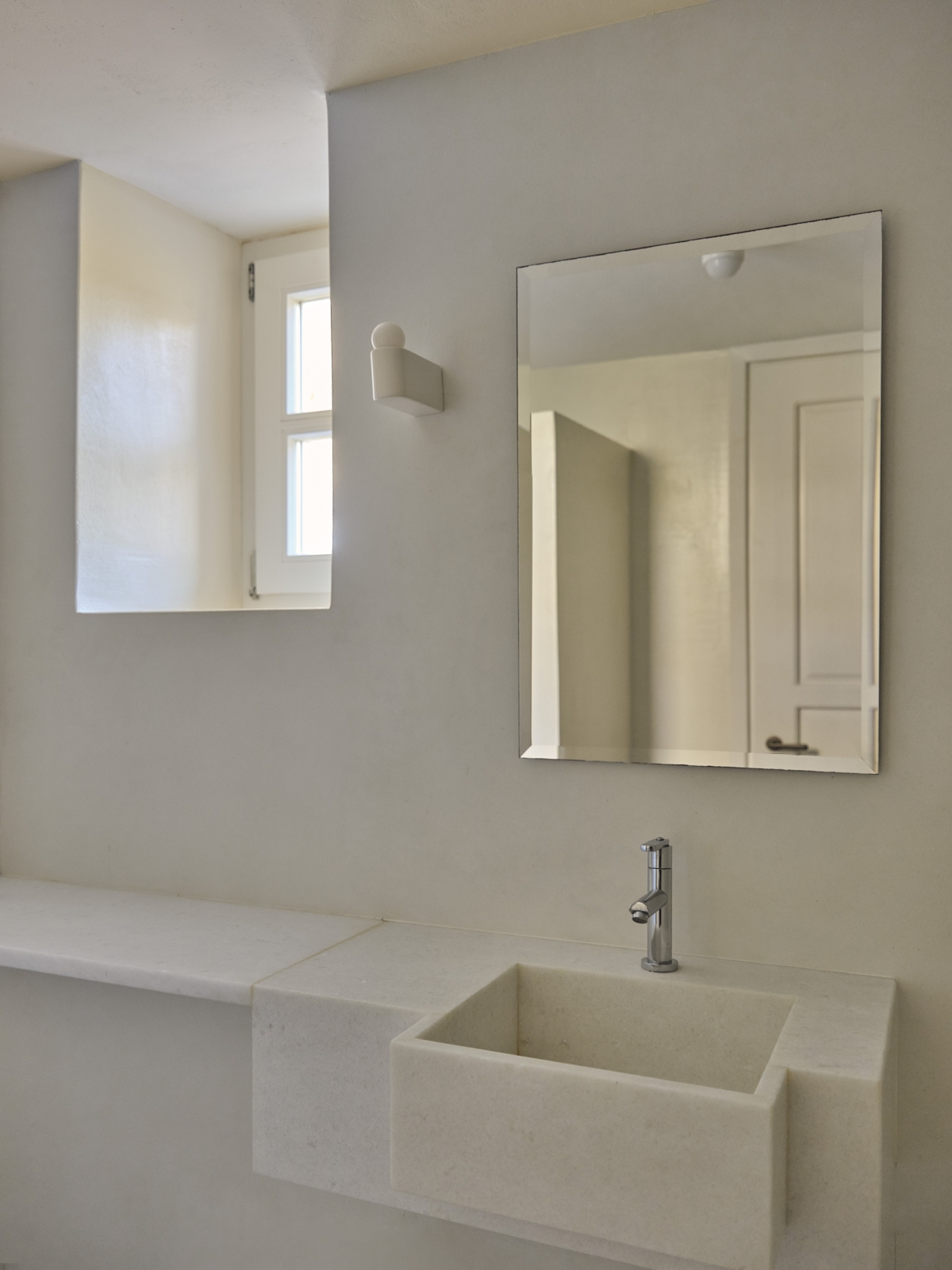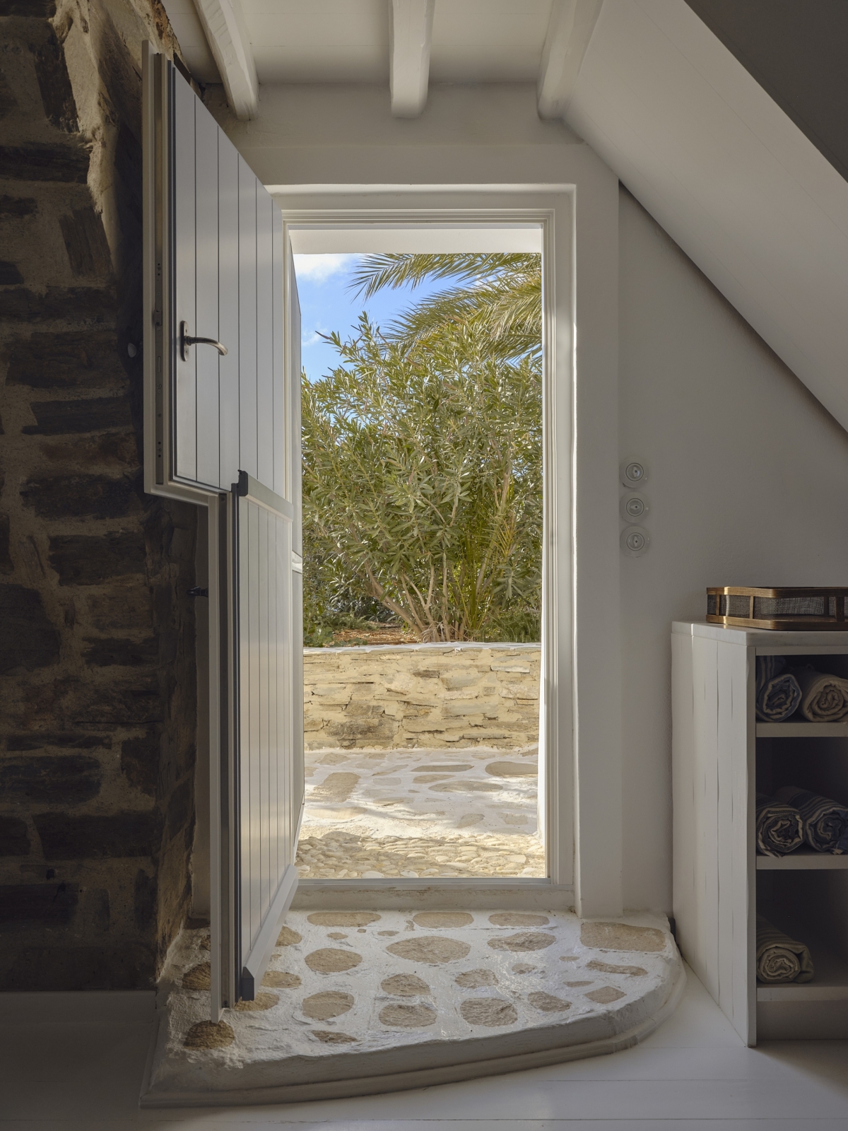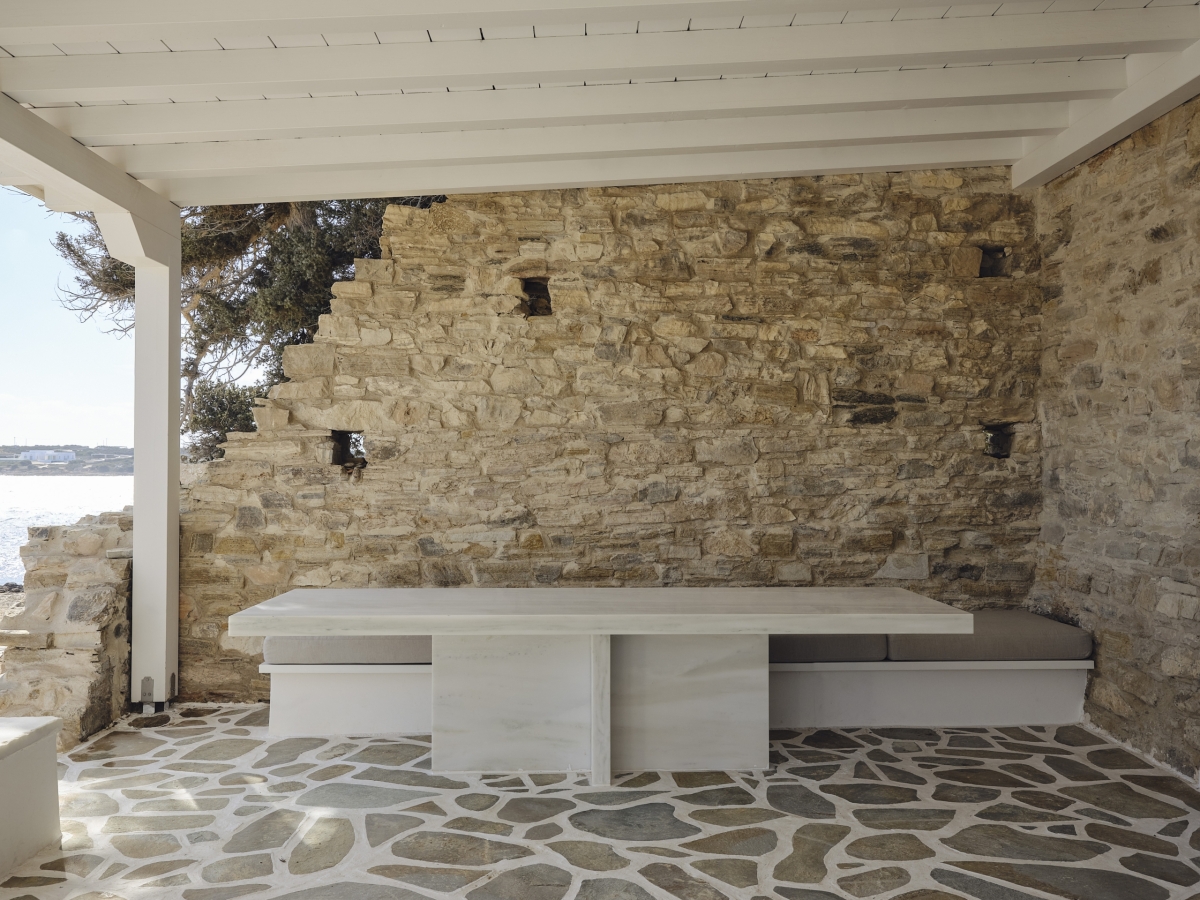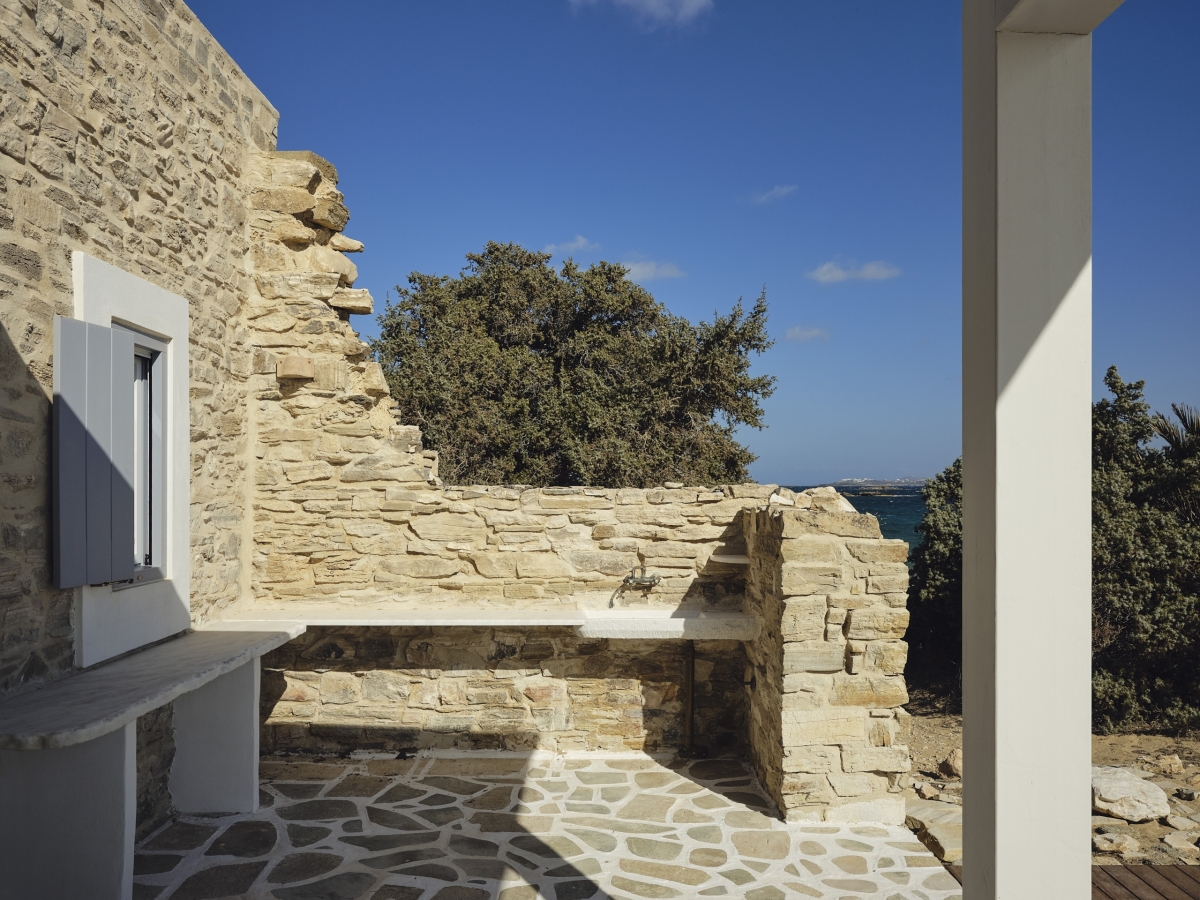 Our first important decision was to respect the building’s idiosyncratic character and treat it as a restoration project, despite its lack of official heritage listing. The building’s landmark status on the island and its role in the collective memory of the place guided our preservation approach. We maintained the exterior intact, restoring and regrouting the exposed stone walls where necessary. The only outdoor additions were a reclaimed marble sink on the exterior counter and a custom-designed Dionysos marble table. We also changed the shutters from dark brown to light blue to enhance the seaside atmosphere.