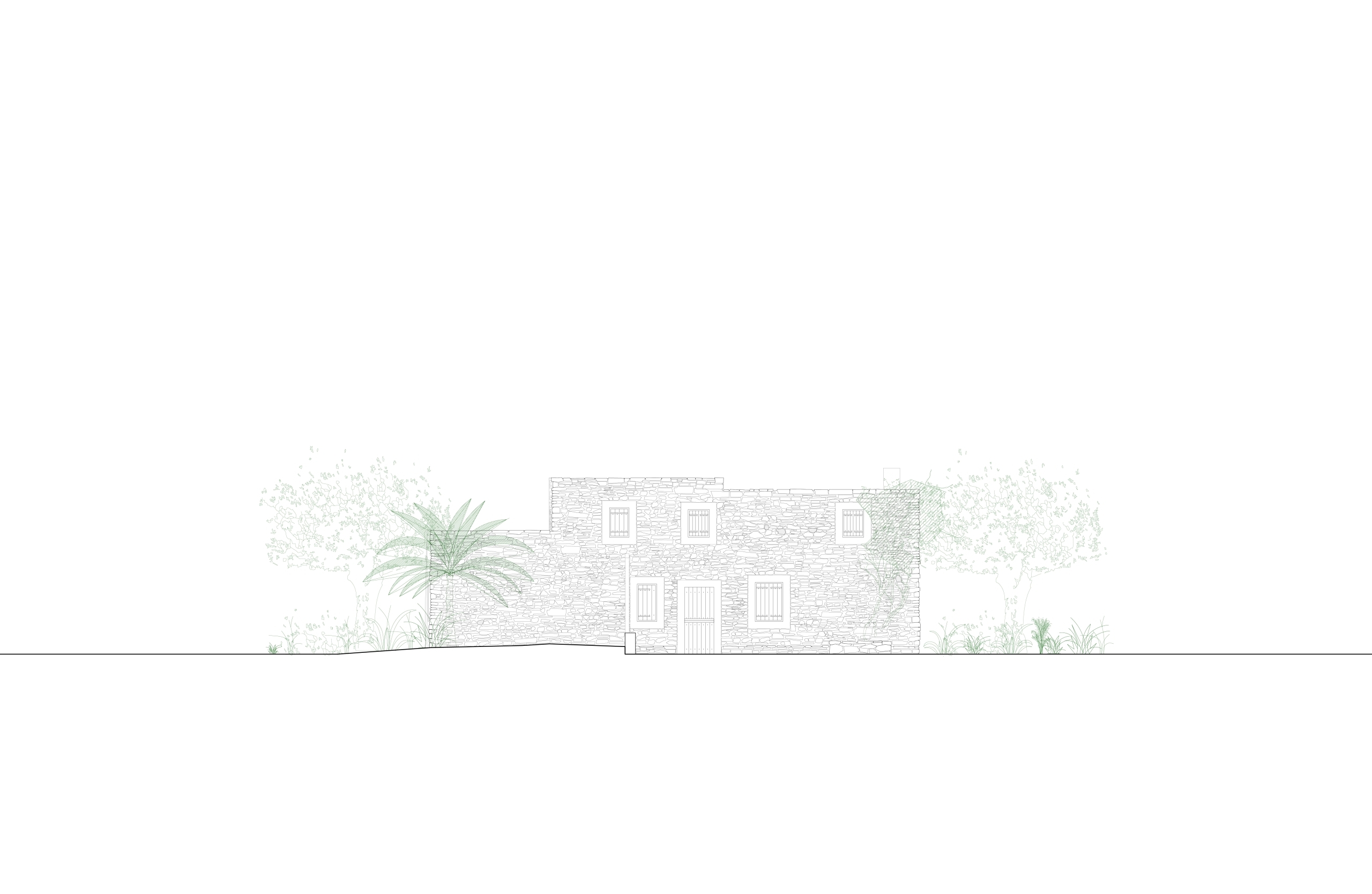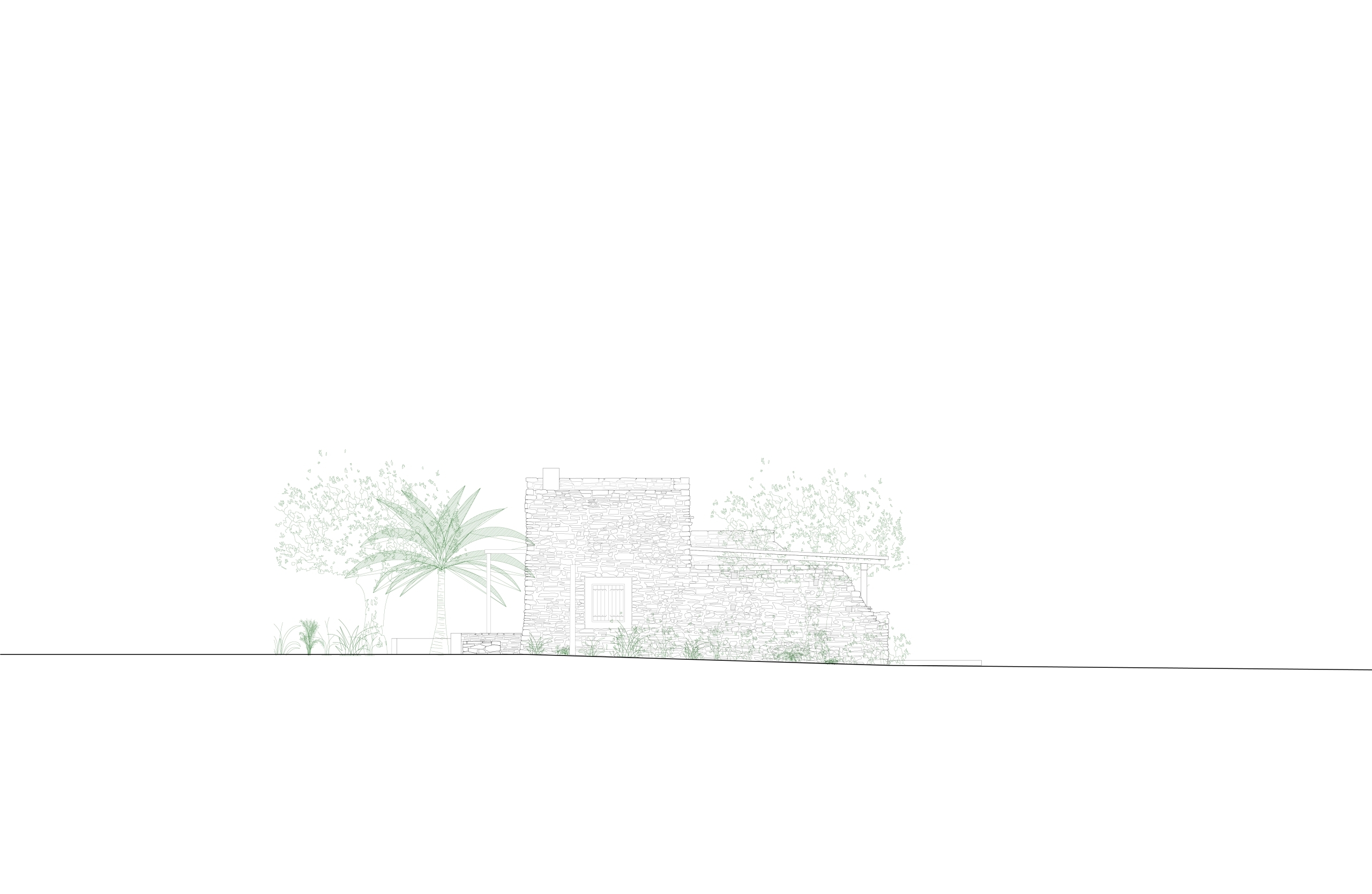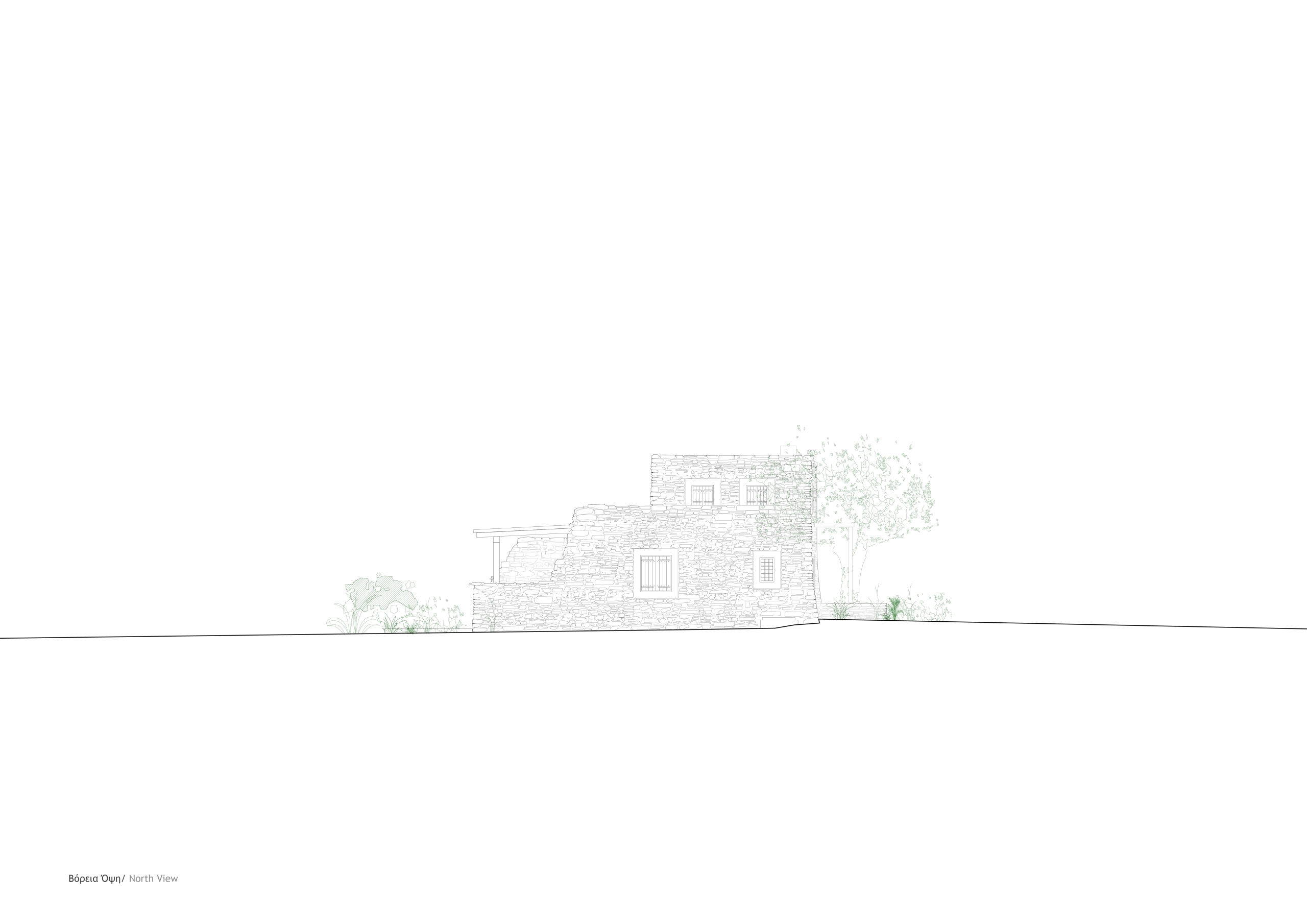 Our first important decision was to respect the building’s idiosyncratic character and treat it as a restoration project, despite its lack of official heritage listing. The building’s landmark status on the island and its role in the collective memory of the place guided our preservation approach. We maintained the exterior intact, restoring and regrouting the exposed stone walls where necessary. The only outdoor additions were a reclaimed marble sink on the exterior counter and a custom-designed Dionysos marble table. We also changed the shutters from dark brown to light blue to enhance the seaside atmosphere.