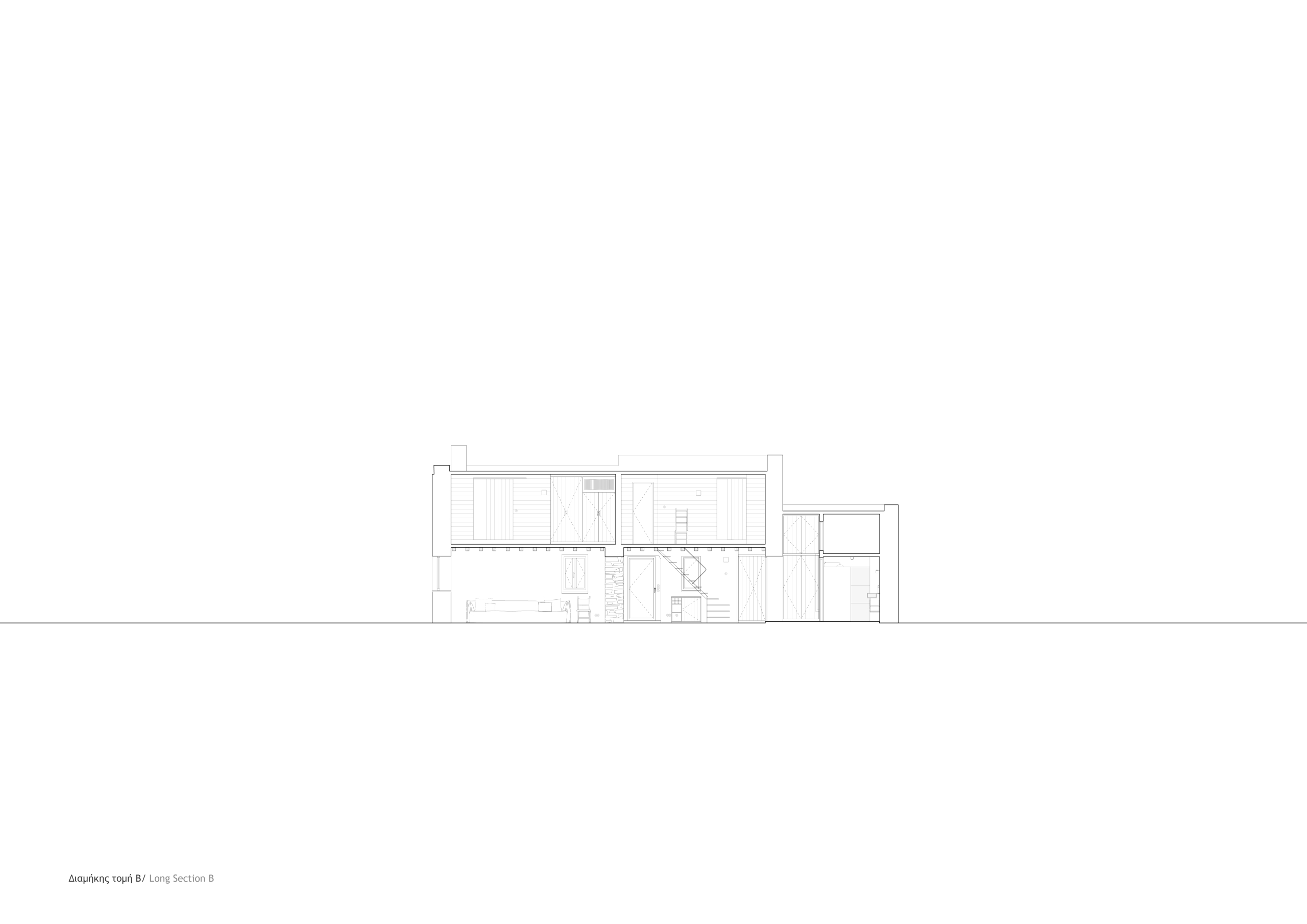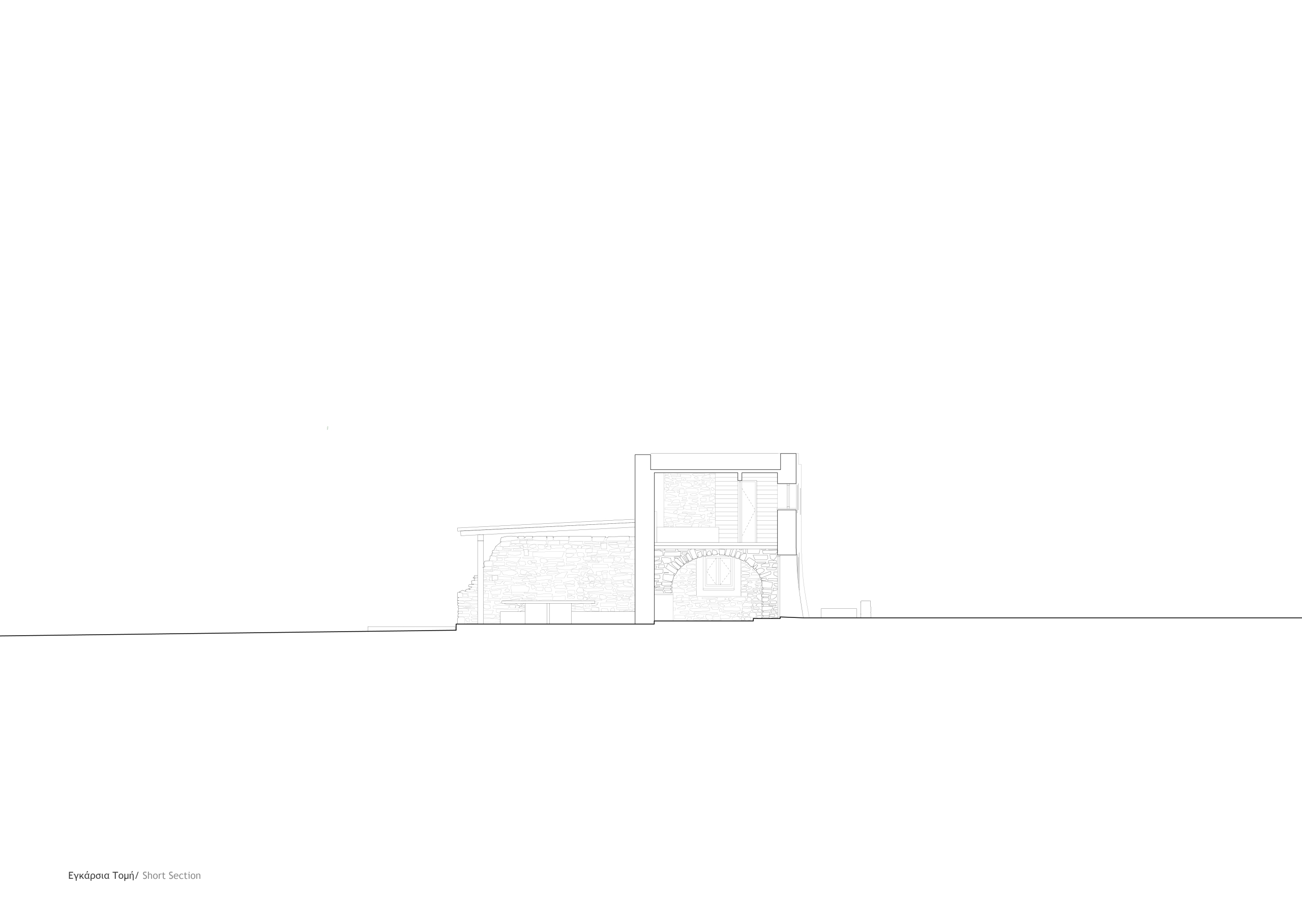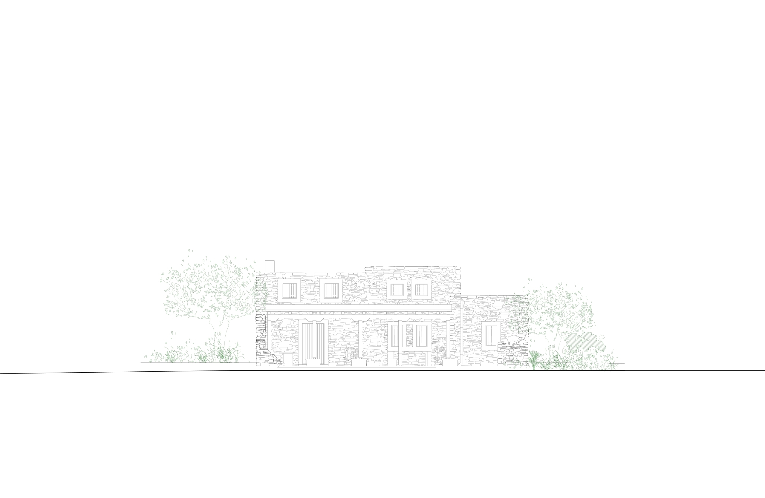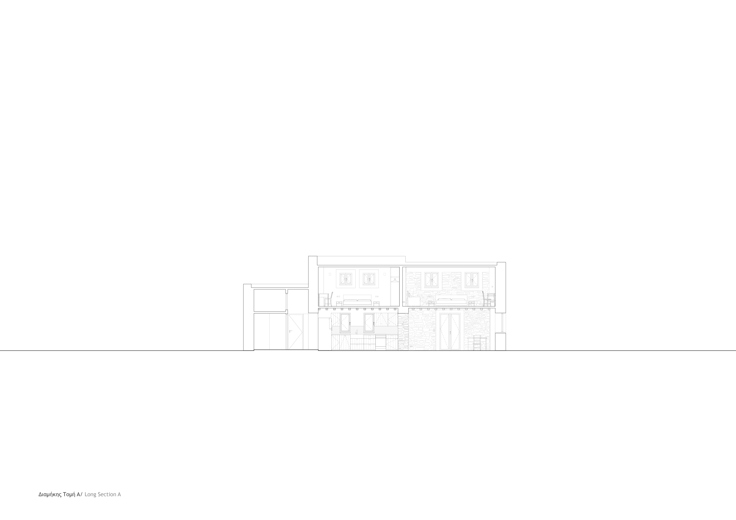 Our first important decision was to respect the building’s idiosyncratic character and treat it as a restoration project, despite its lack of official heritage listing. The building’s landmark status on the island and its role in the collective memory of the place guided our preservation approach. We maintained the exterior intact, restoring and regrouting the exposed stone walls where necessary. The only outdoor additions were a reclaimed marble sink on the exterior counter and a custom-designed Dionysos marble table. We also changed the shutters from dark brown to light blue to enhance the seaside atmosphere.