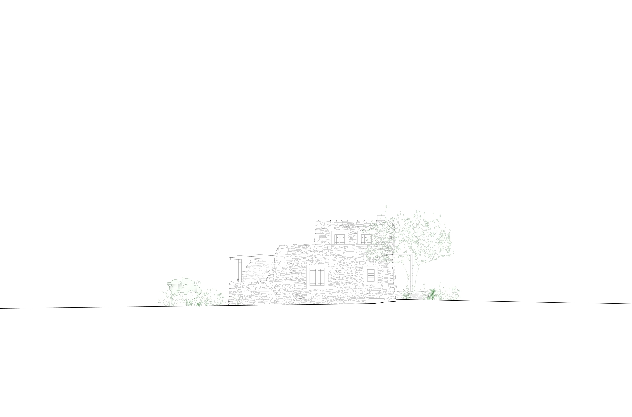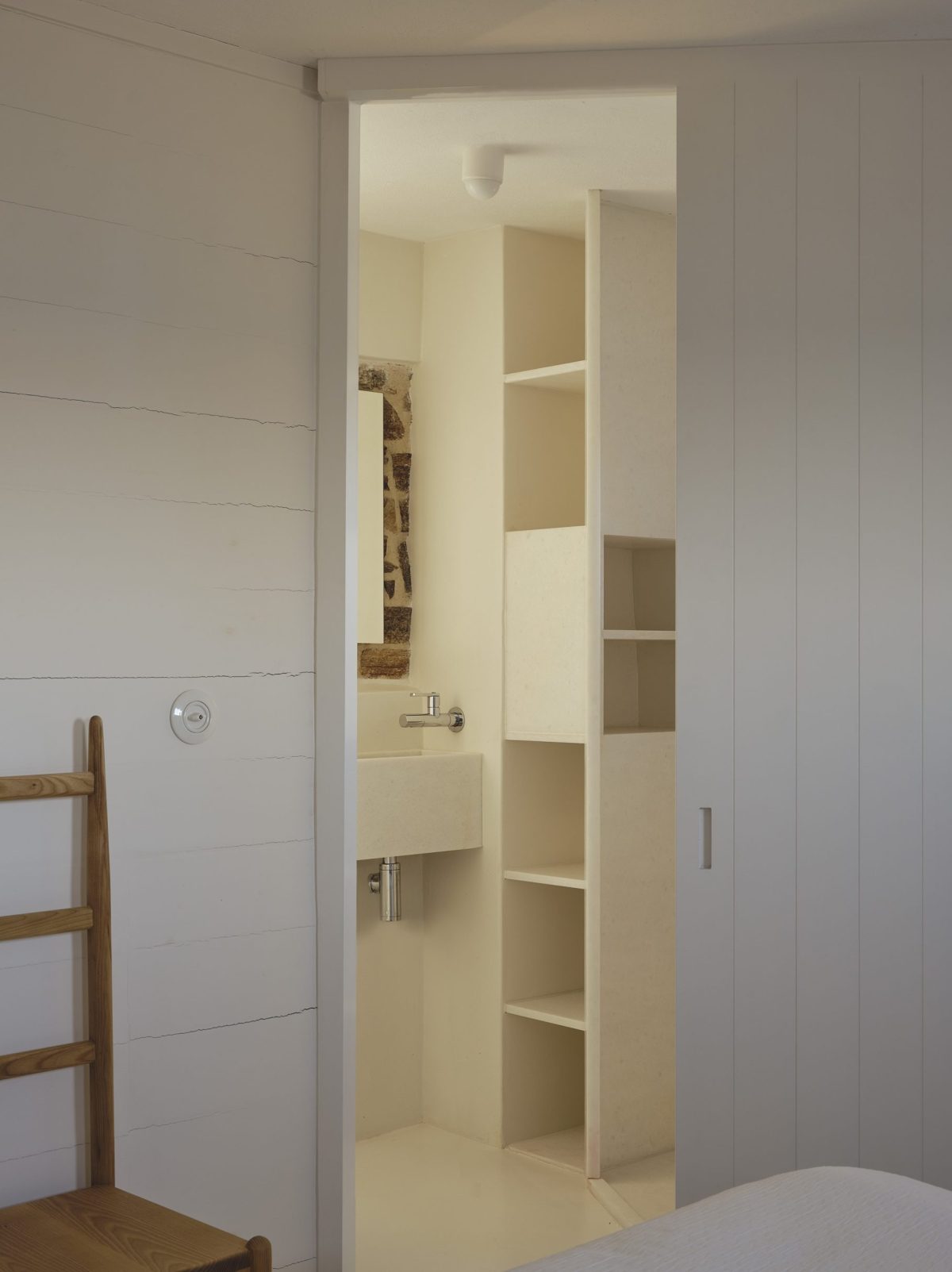 For the interiors, we preserved existing materials while introducing white-painted solid oak wood and Naxos marble from the neighboring island. We approached the layout like acupuncture—making small, strategic changes for maximum impact. Our interventions focused on rearranging interior spaces, particularly the bathrooms and kitchen cabinetry, to improve functionality. The combination of natural, local materials with clean lines creates harmony between vernacular and contemporary aesthetics.