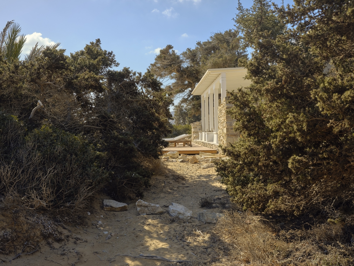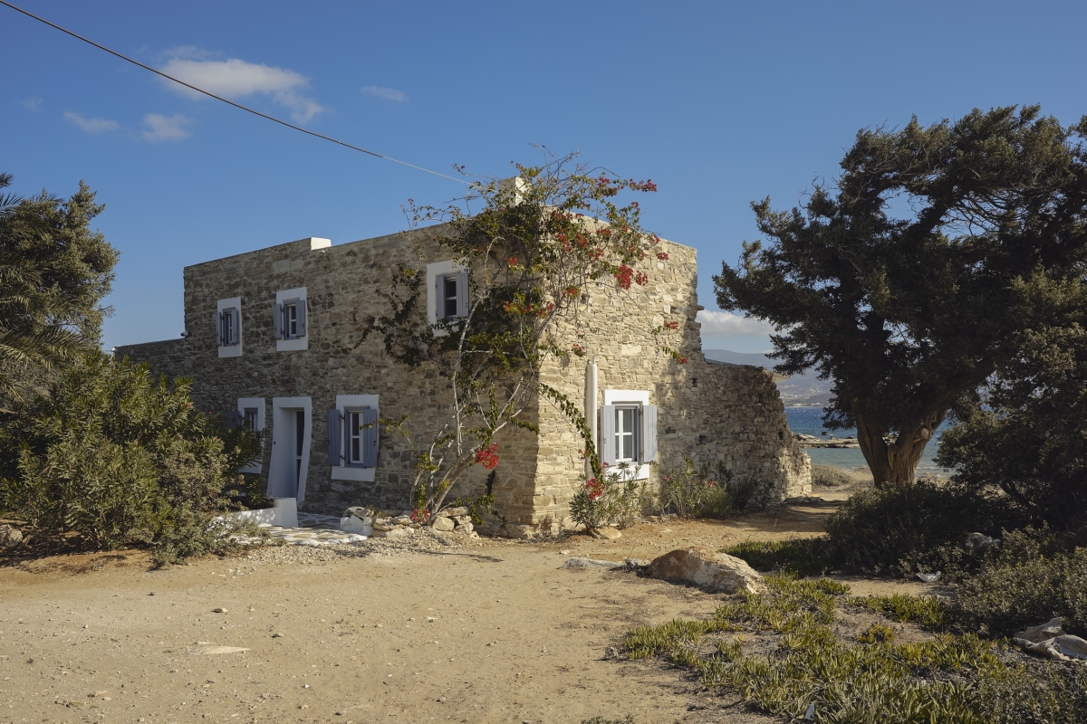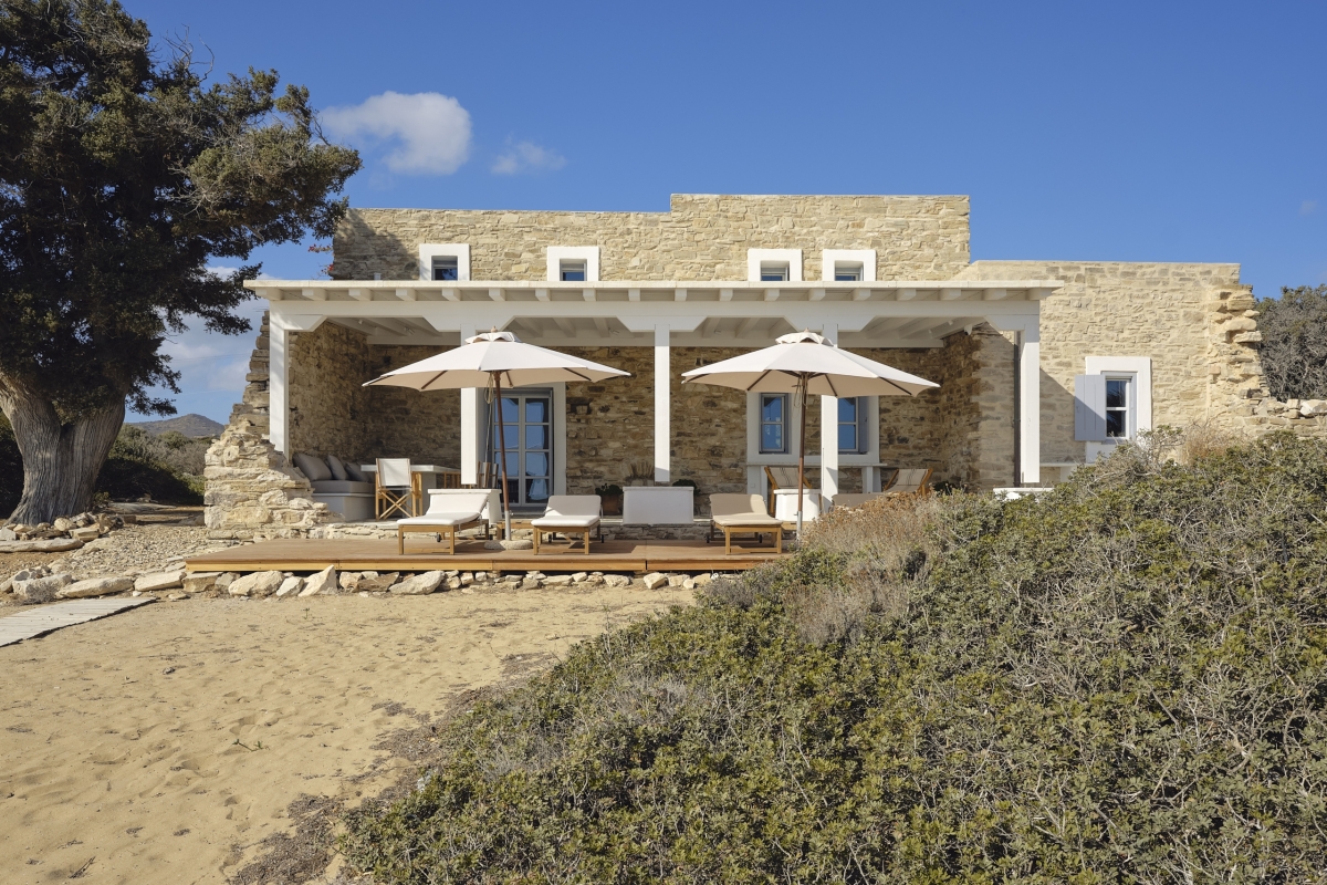Patitiri, which translates to “winepress” in Greek, is a historic stone building constructed between 1933 and 1936 on the shore of Antiparos, a small island in the Cyclades. People would gather here to practice the traditional wine-making process of grape stomping —stepping barefoot on grapes placed in vats to release their juices and begin fermentation. Ancient traces found in the sea reveal that people have been growing vines in this area since antiquity. Over time, through various changes in ownership, Patitiri has transformed into a beautiful beachfront getaway.