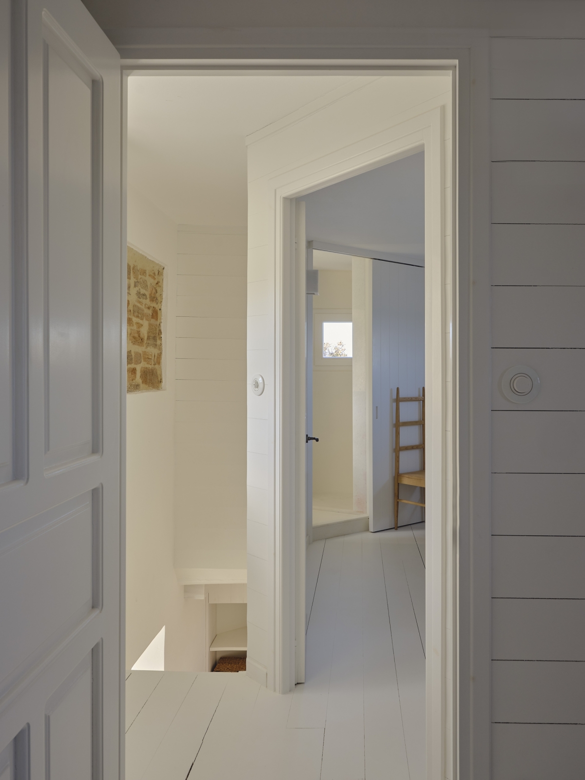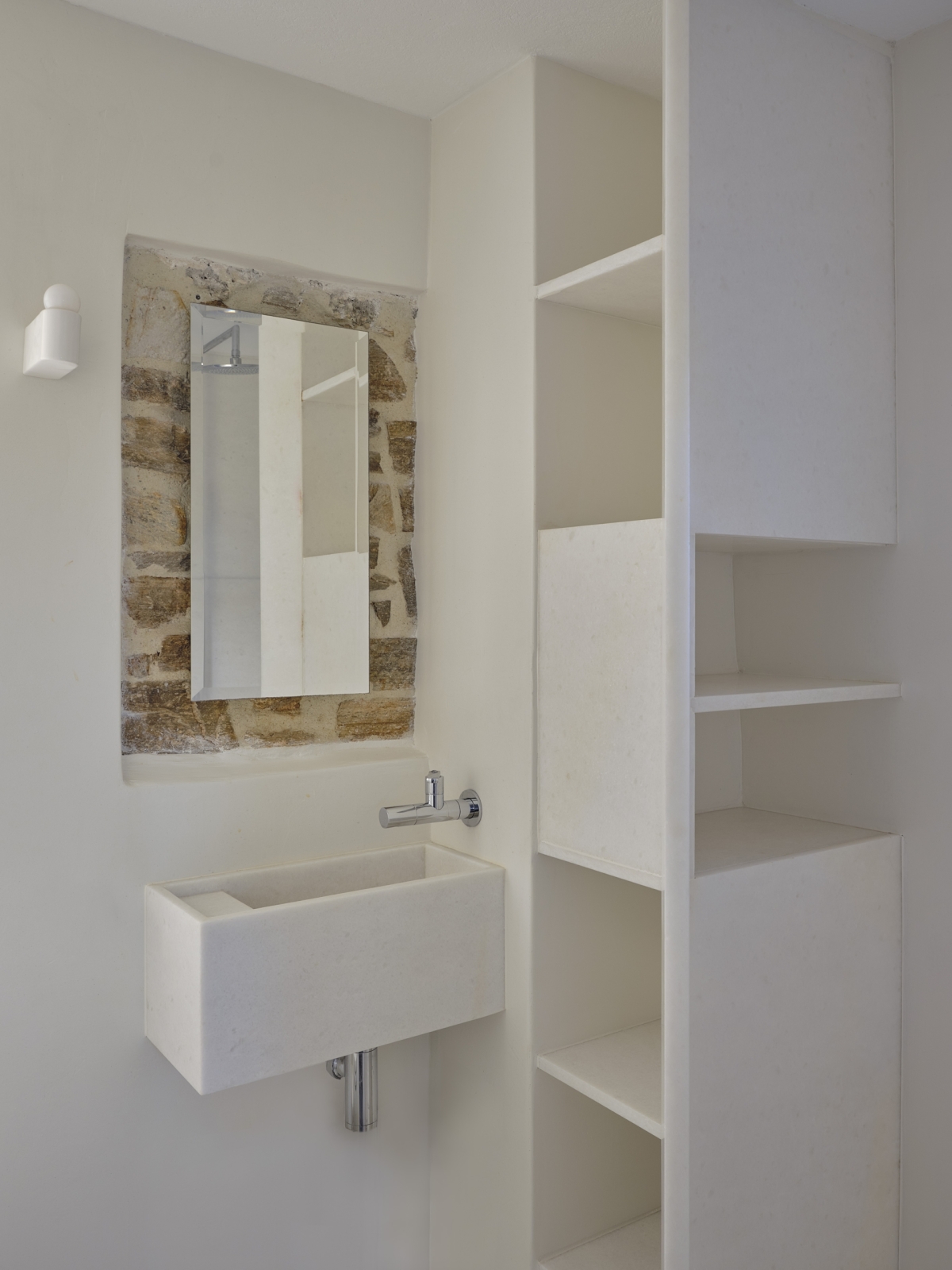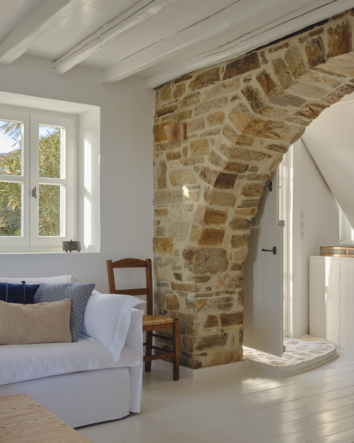 For the interiors, we preserved existing materials while introducing white-painted solid oak wood and Naxos marble from the neighboring island. We approached the layout like acupuncture—making small, strategic changes for maximum impact. Our interventions focused on rearranging interior spaces, particularly the bathrooms and kitchen cabinetry, to improve functionality. The combination of natural, local materials with clean lines creates harmony between vernacular and contemporary aesthetics. This thoughtful balance of past and present extends throughout the architectural details and furnishings chosen for the summer residence.