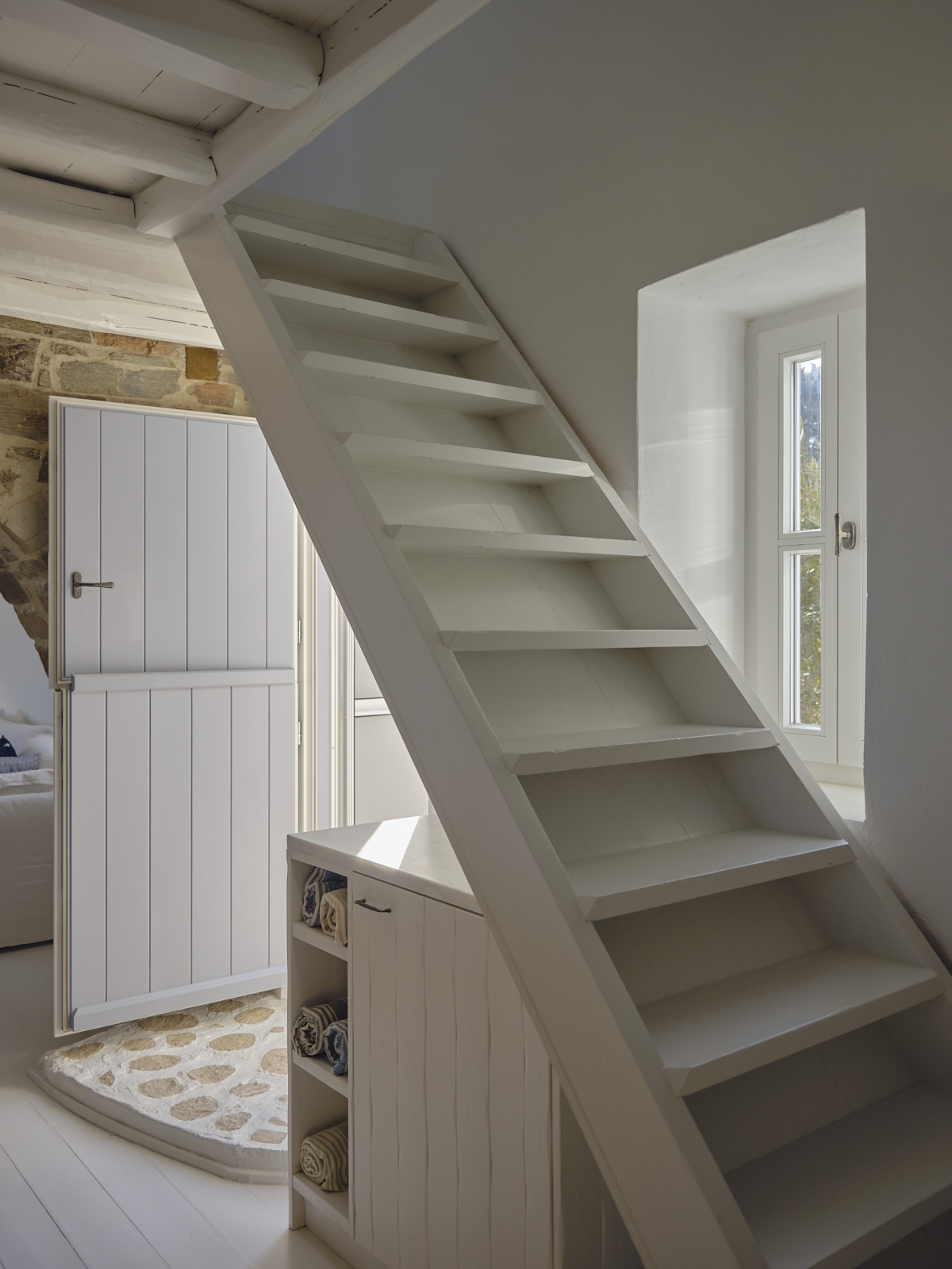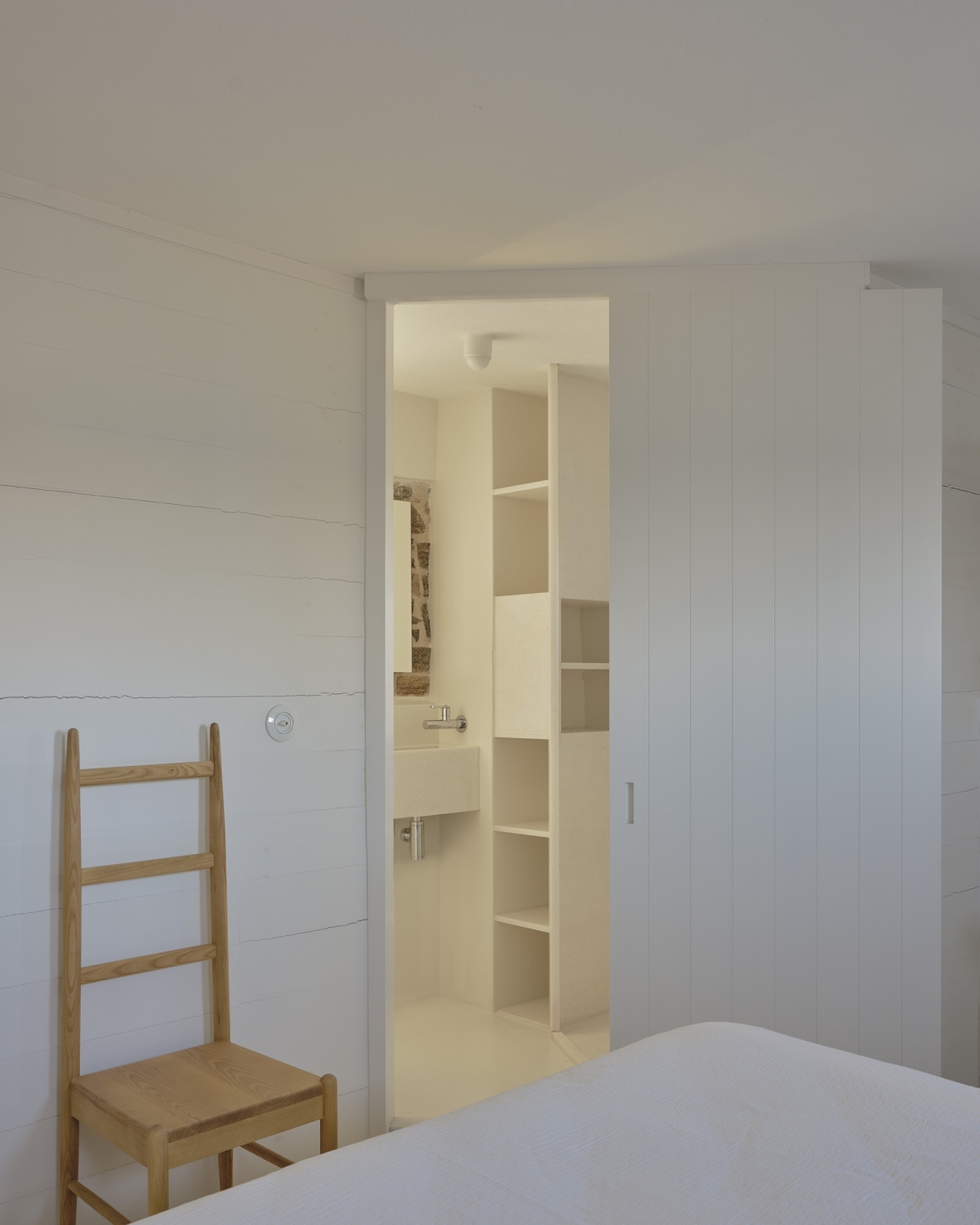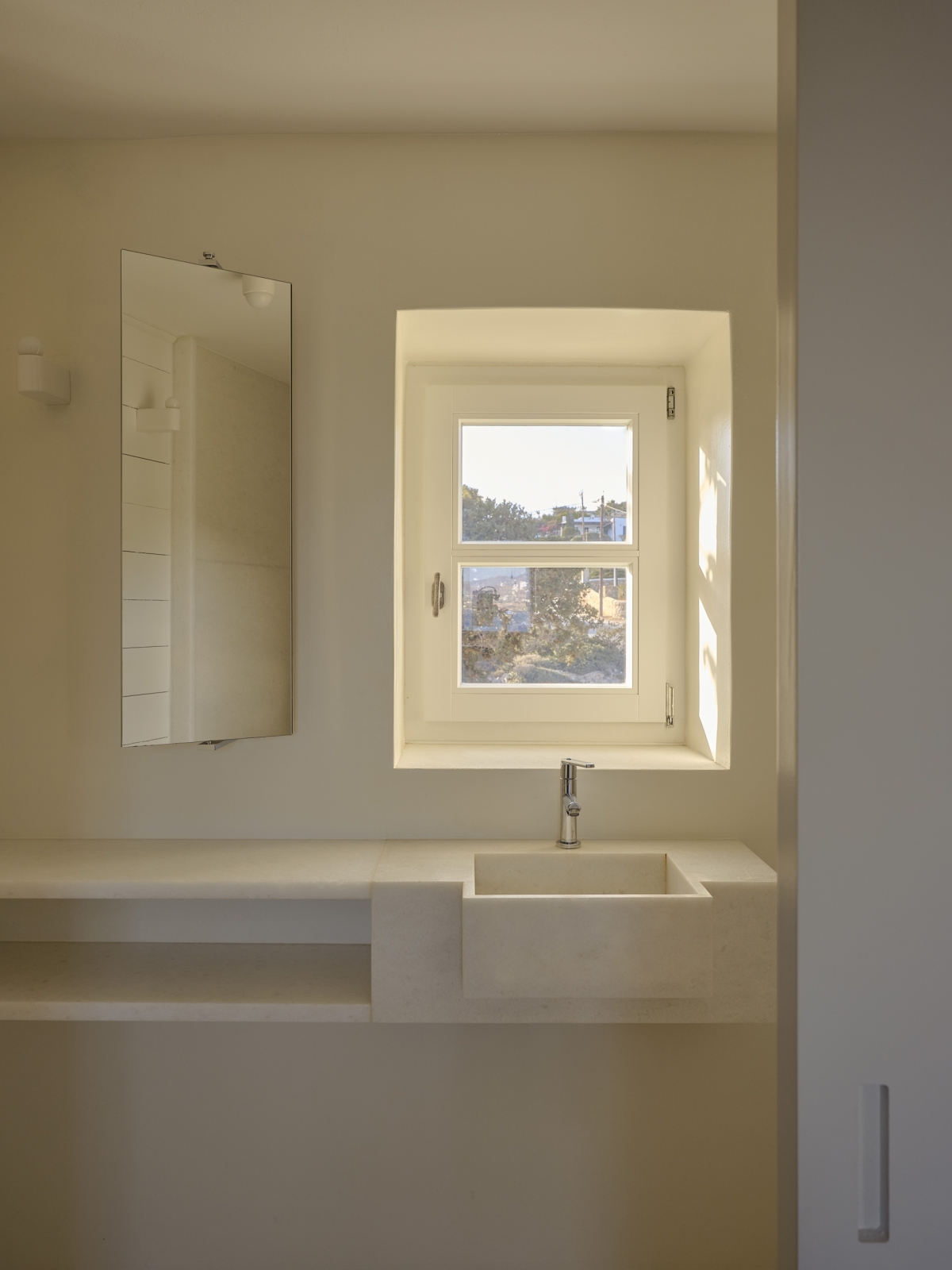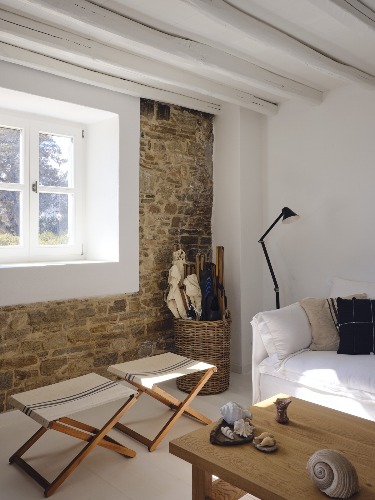 For the interiors, we preserved existing materials while introducing white-painted solid oak wood and Naxos marble from the neighboring island. We approached the layout like acupuncture—making small, strategic changes for maximum impact. Our interventions focused on rearranging interior spaces, particularly the bathrooms and kitchen cabinetry, to improve functionality. The combination of natural, local materials with clean lines creates harmony between vernacular and contemporary aesthetics. This thoughtful balance of past and present extends throughout the architectural details and furnishings chosen for the summer residence.