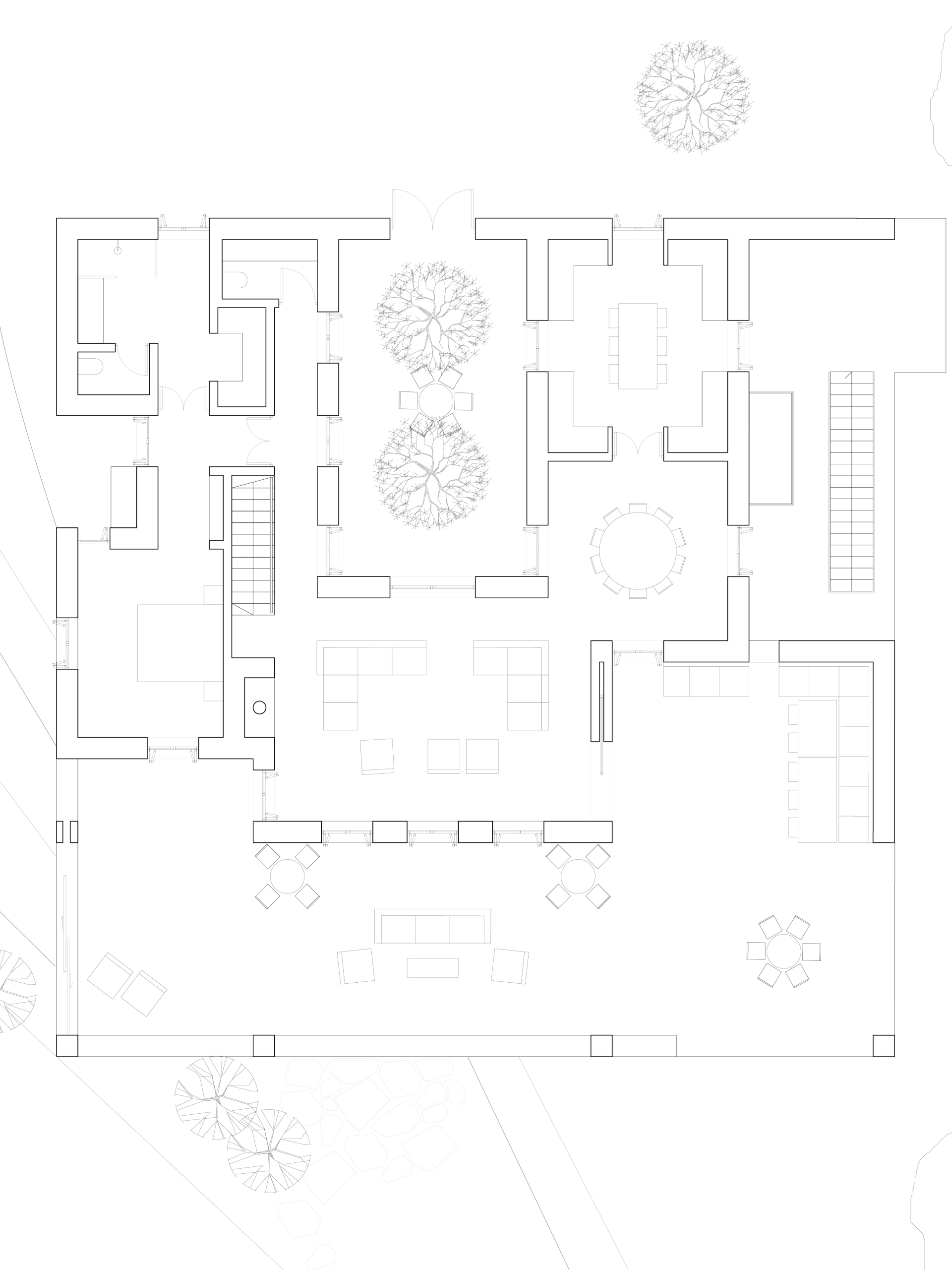 Responding to both the regulatory framework and the client’s request for a square residence, the project explores the relationship between interior and exterior space as a means of extending the house spatially and volumetrically beyond its permitted footprint. The design alternates between enclosed and open areas, achieving geometric clarity within strict limits.