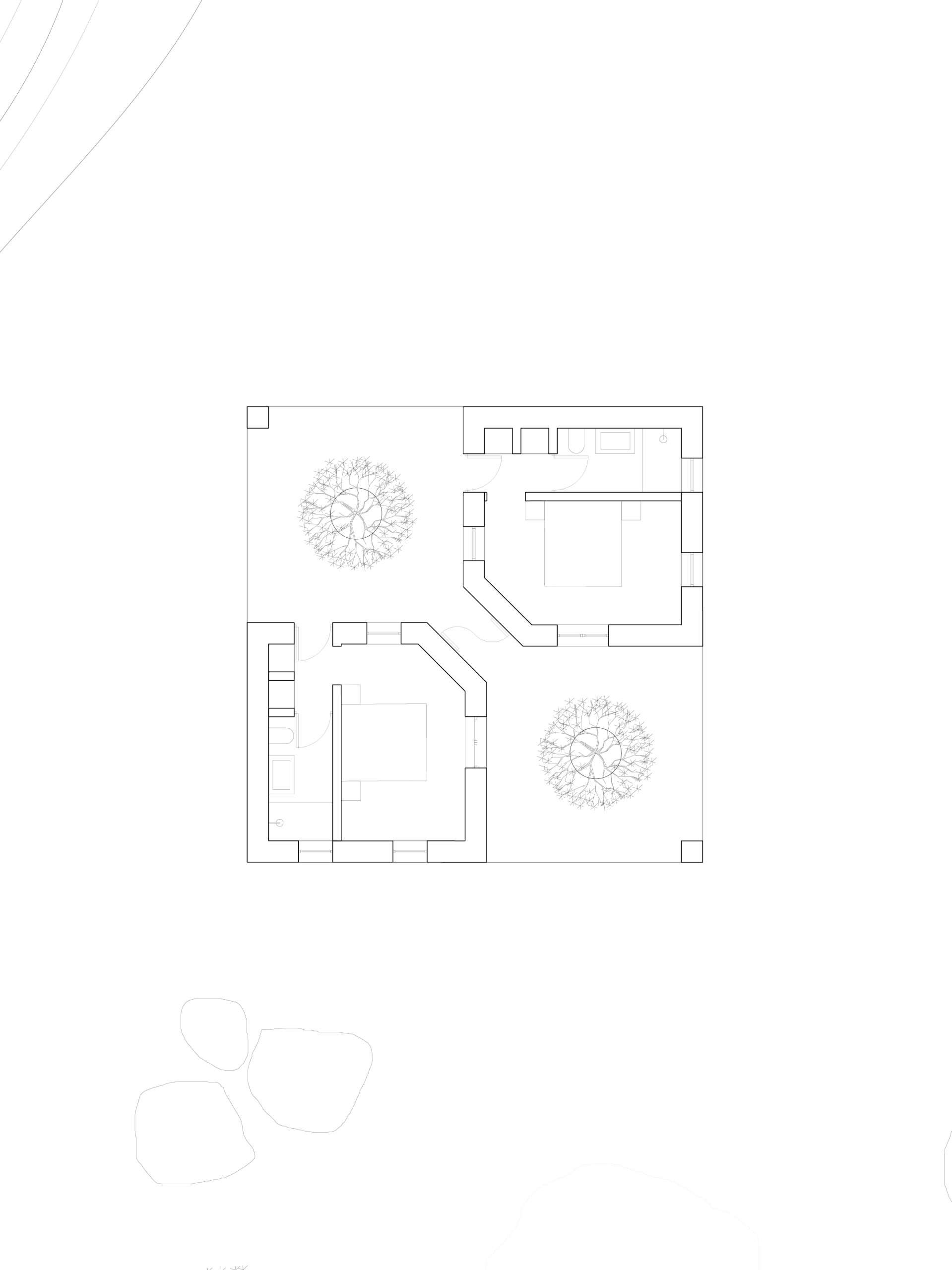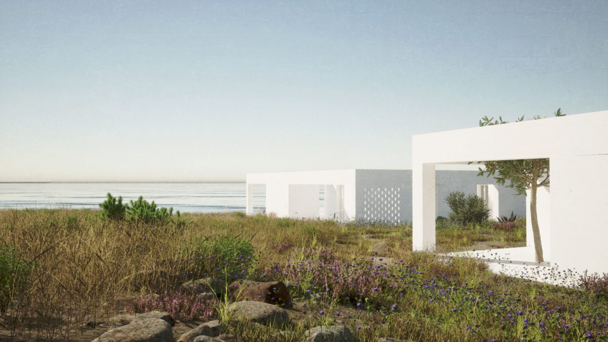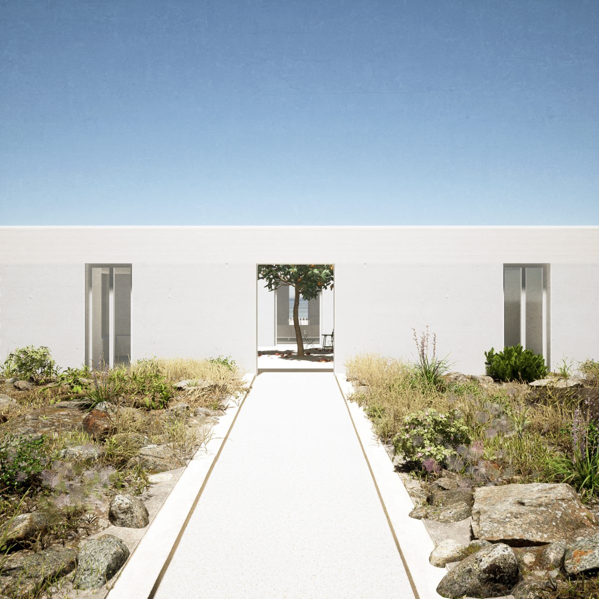 Square House is a summer residence on the island of Antiparos, located on a seafront plot bordered by a stream and a forest. Local regulations impose setbacks from these natural boundaries, leaving only a limited and irregular buildable area for primary enclosed spaces. Exterior canopies, however, are permitted to extend beyond these constraints.