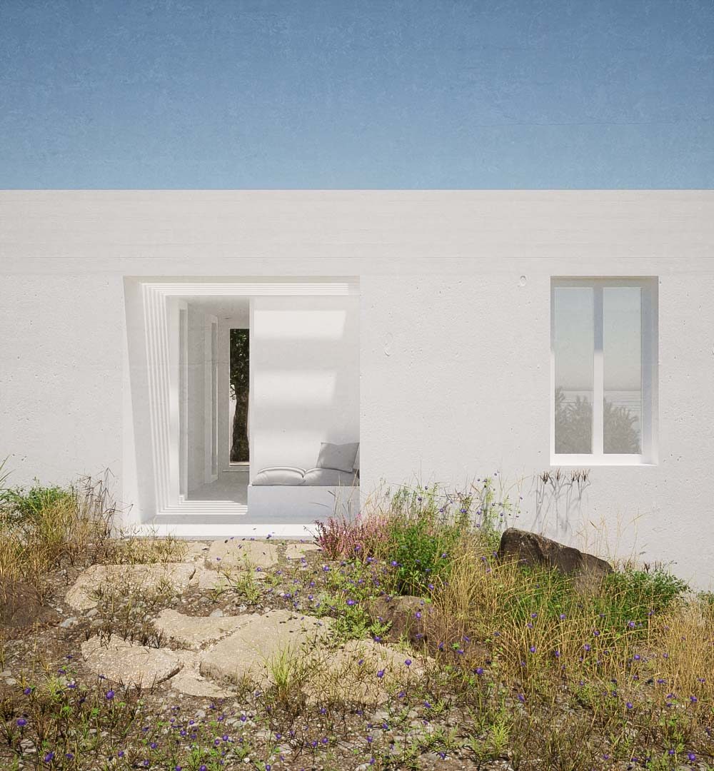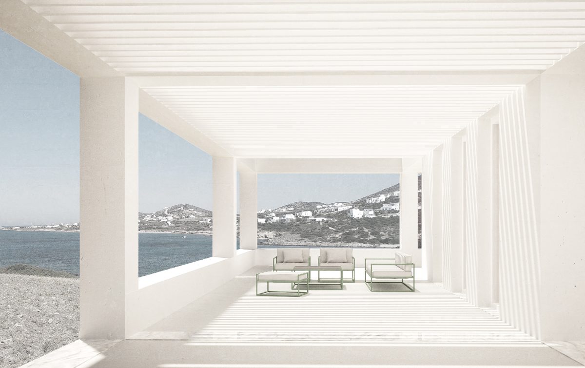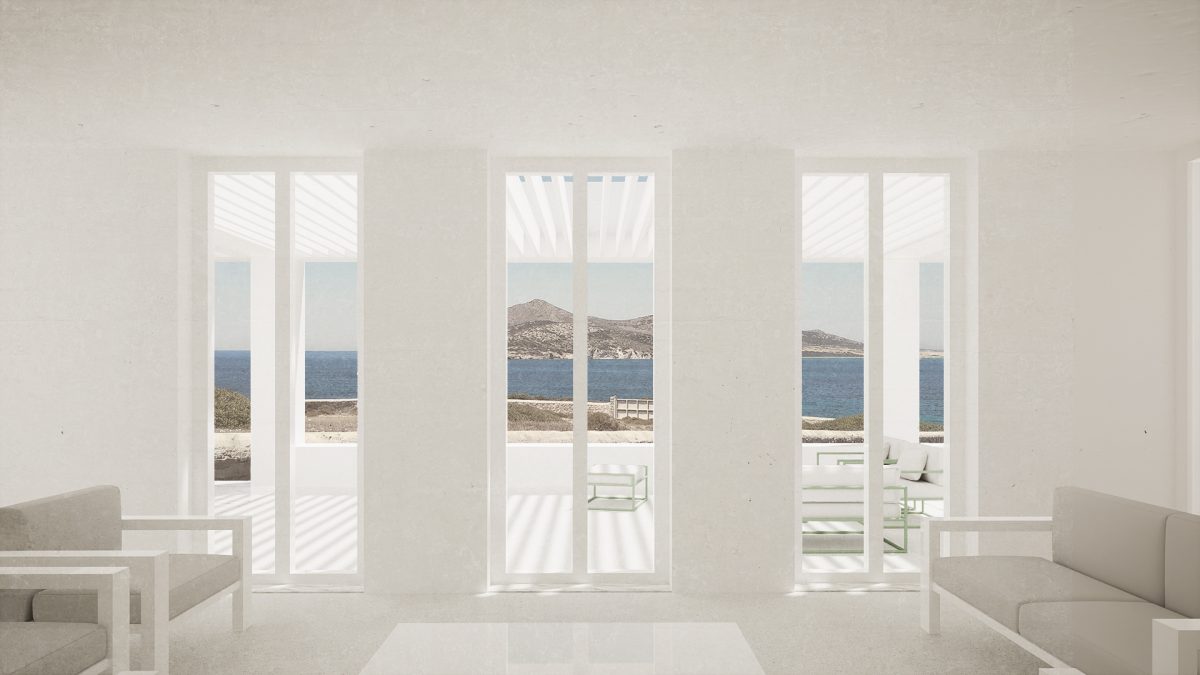 Floor-to-ceiling openings are positioned to frame views of the western horizon and the archaeological island of Despotikon, allowing light, movement, and landscape to shape the experience of the house.